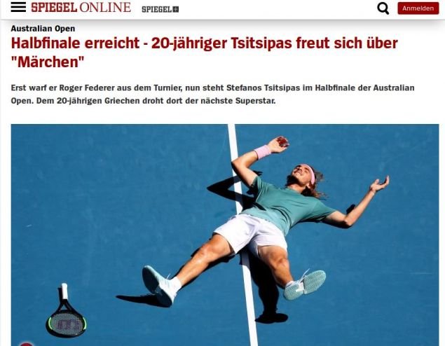 Το Γερμανικό Spiegel γράφει πως «Έφθασε στα ημιτελικά – ο 20χρονος Τσιτσιπάς και χαίρεται για το “όνειρό” του, πρώτα πέταξε έξω απ’ το τουρνουά τον Ρ. Φέντερερ, τώρα ο Στέφανος Τσιτσιπάς βρίσκεται στα ημιτελικά του Αustralian Open, όπου ο ετοιμάζεται να αντιμετωπίσει τον επόμενο σούπερσταρ», αναφέρει το γερμανικό περιοδικό.