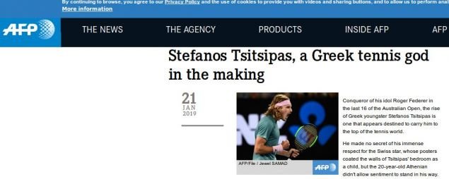 Το Γαλλικό Πρακτορείο σε εκτενές άρθρο του που έχει τίτλο «Ένας Έλληνας θεός του τένις γεννιέται», σημειώνει ότι «η άνοδος του νεαρού Έλληνα που νίκησε το ίνδαλμα του Φεντερέρ, φαίνεται προορισμένη να τον οδηγήσει στην κορυφή του παγκόσμιου τένις».