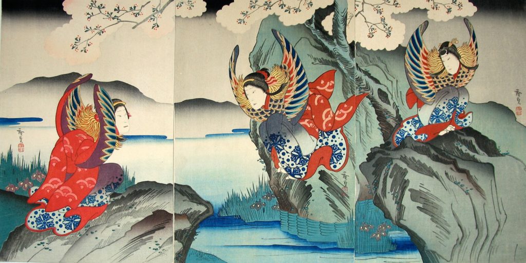 Foto:Commons Wikimedia.Kabuki scene by Utagawa Hirosada, the actors Nakamura Tamashichi I,Sawamura Kitō I and Arashi Rikaku II as spirits of mandarin ducks 1849